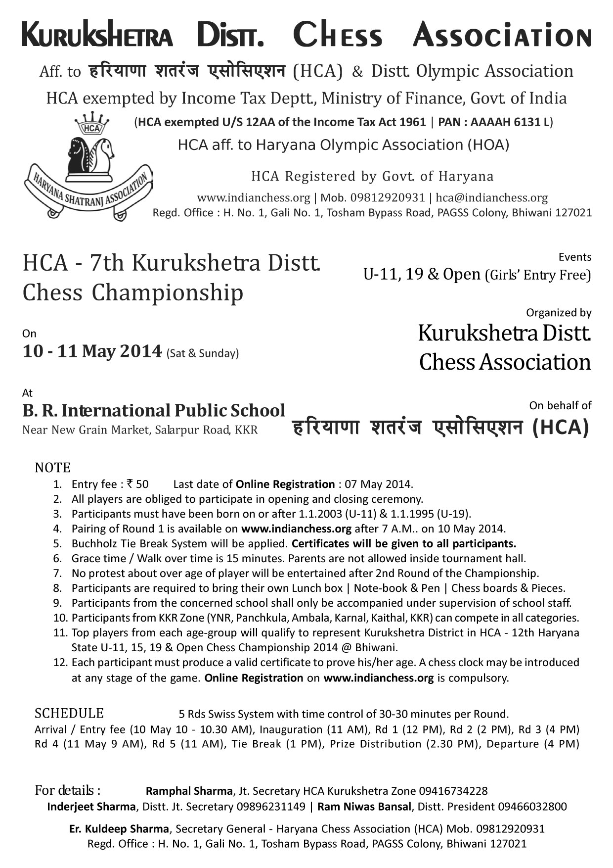 10 - 11 May : HCA - 7th Kurukshetra Distt. U-11, 19 & Open (Mixed) Chess Championship @ B. R. International Public School, Salarpur Road, Kurukshetra